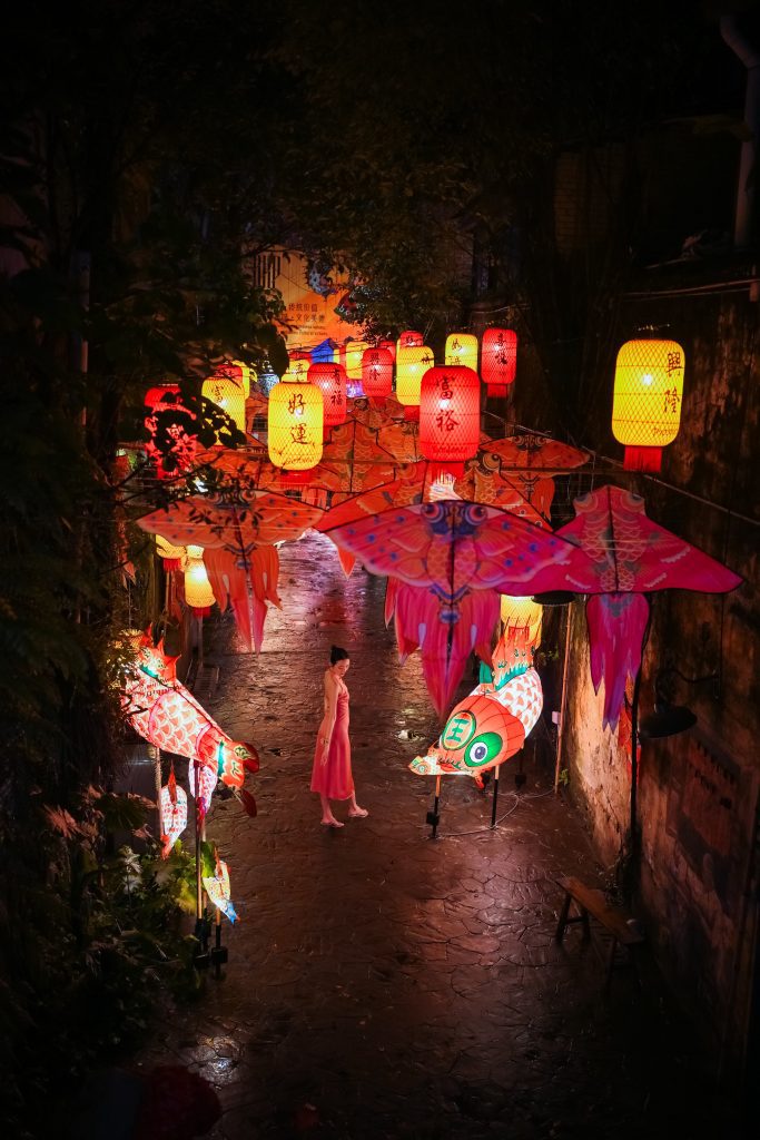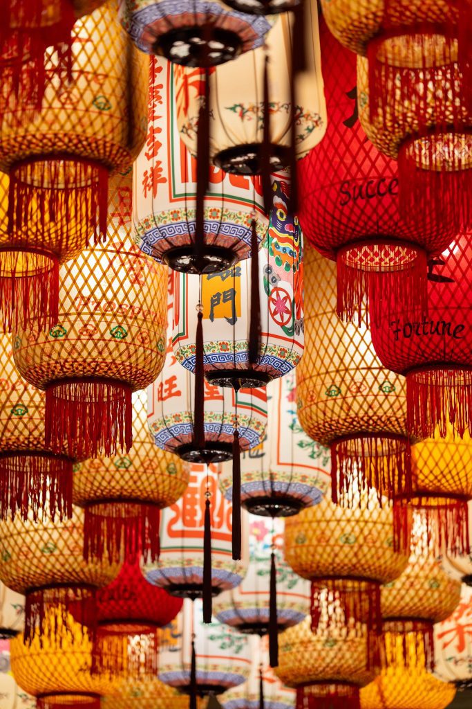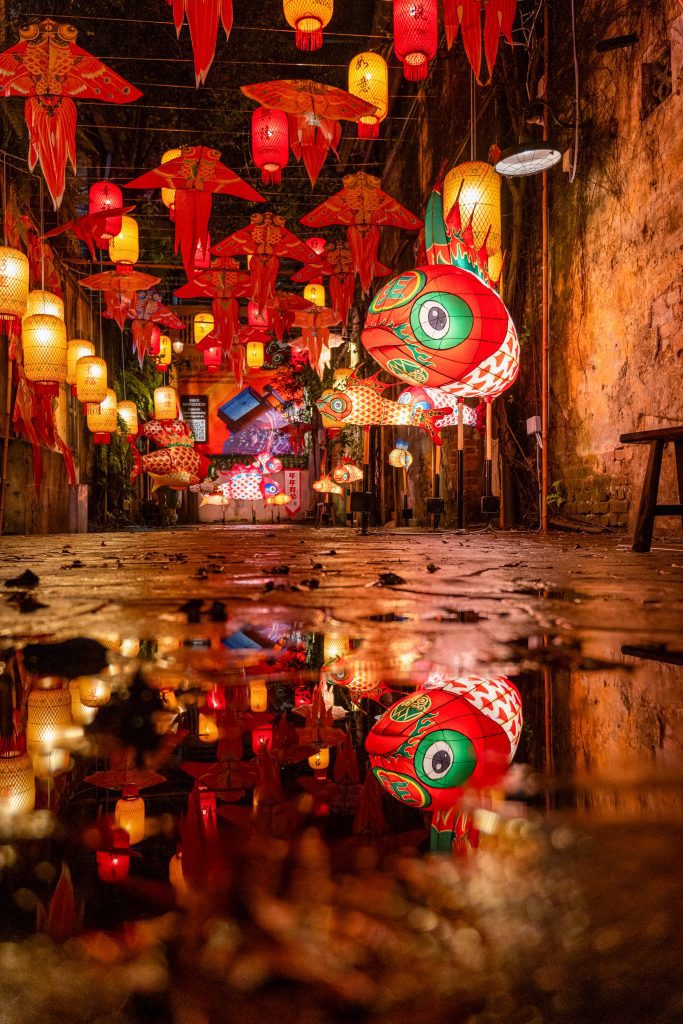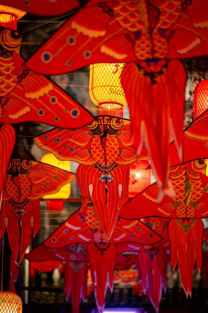 Aadorned with vibrant lanterns inscribed with well-wishes of 满足 (contentment) and 祝福 (blessings) Art installation features 148 lanterns and fish lanterns crafted with traditional methods Installation tells the story behind the significance & symbolism of fish in Chinese culture, folklore and values.